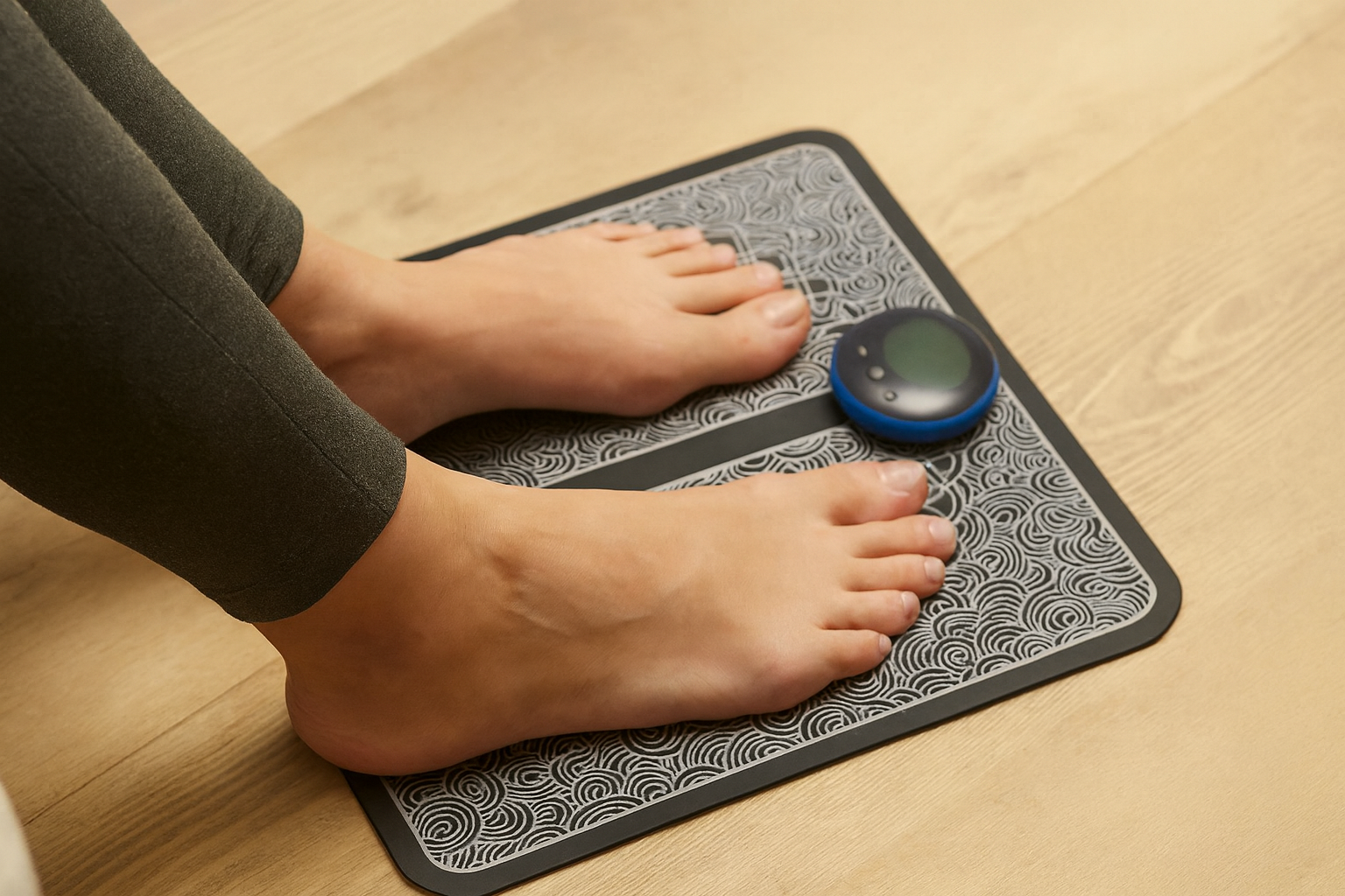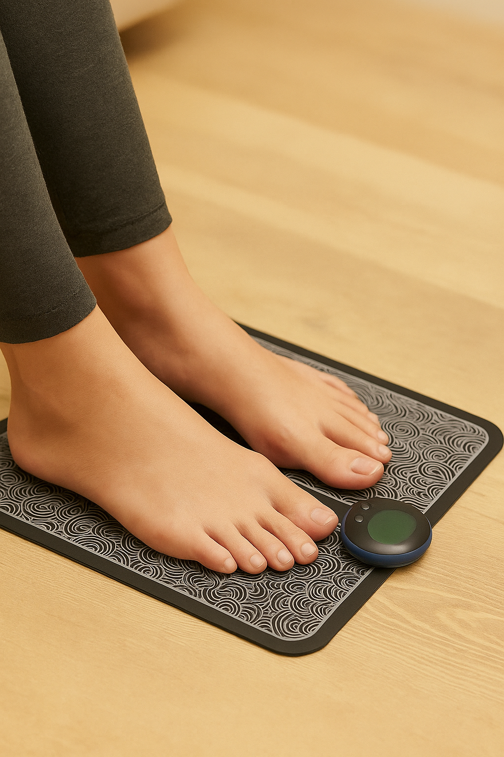 Just place your feet on the mat and adjust the intensity. No complicated screens or bulky plastic machines.